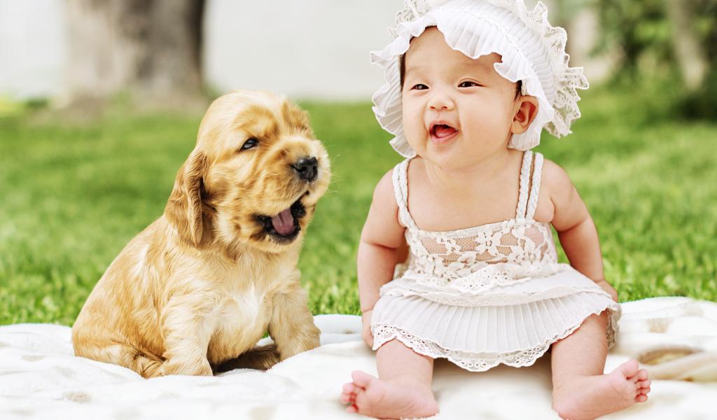 Wallpaper Little girl with a puppy in a meadow
