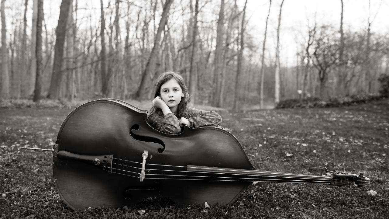 Wallpaper Little girl with cello sitting in the park