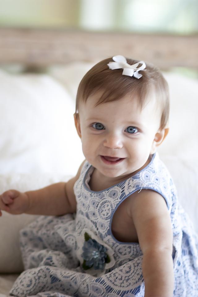 Wallpaper Smiling little girl in a beautiful dress with a green apple in hand
