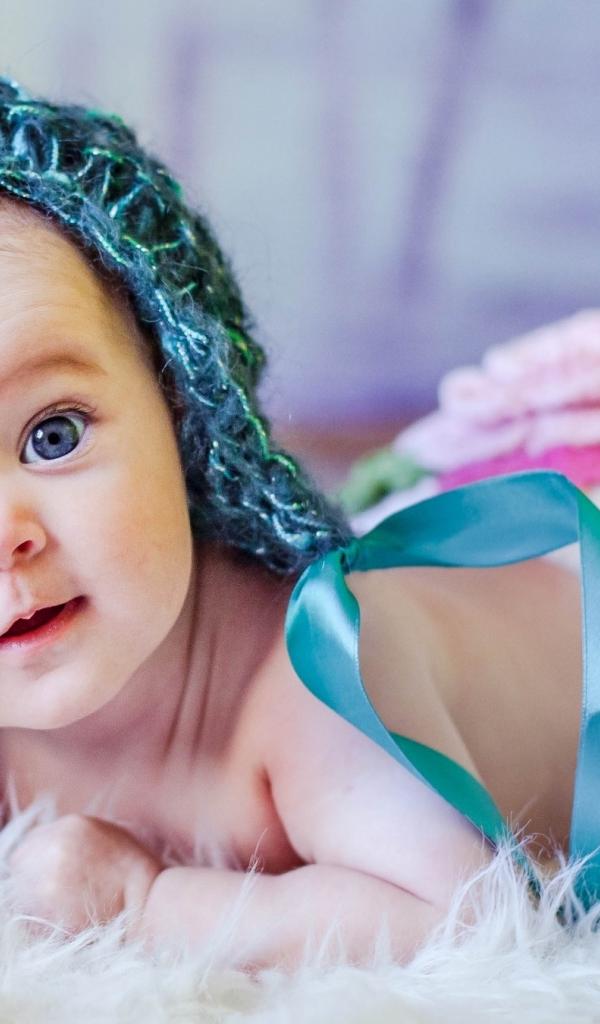 Wallpaper Blue-eyed little girl in a knitted hat with ribbons