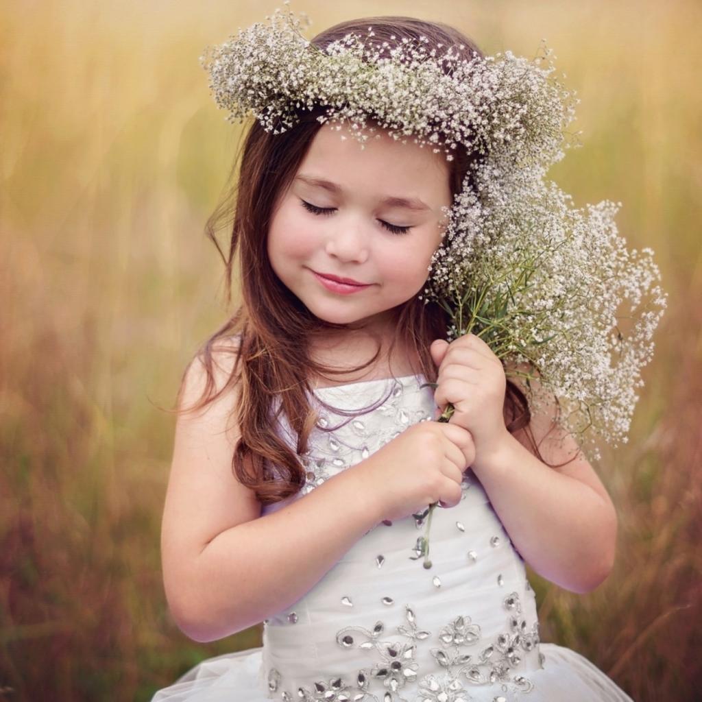 Wallpaper Little girl in a wreath with a bouquet of wildflowers