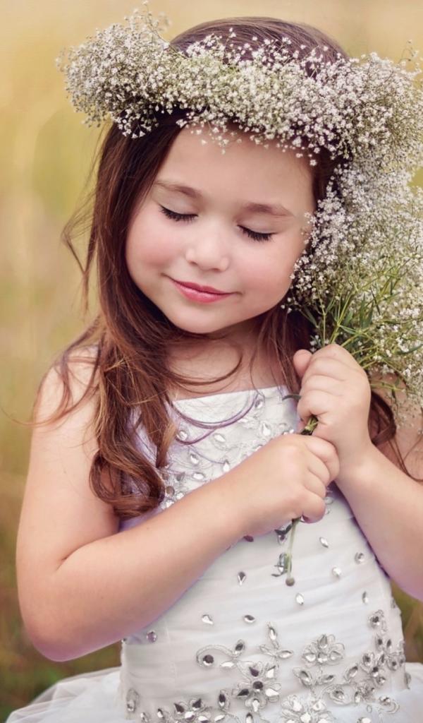 Wallpaper Little girl in a wreath with a bouquet of wildflowers