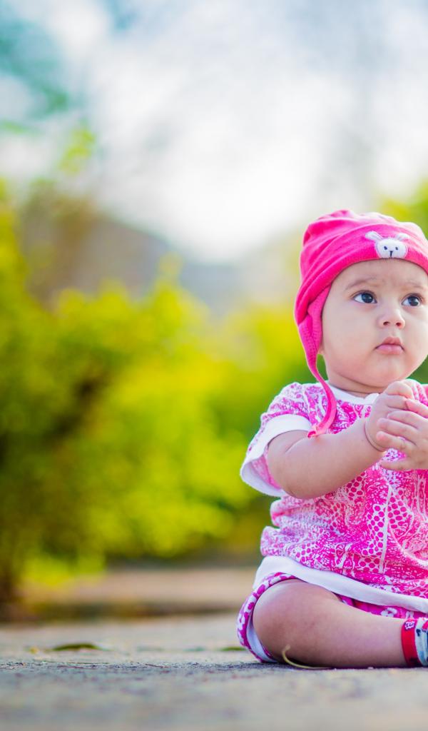 Wallpaper Little girl in pink suit sitting on the ground