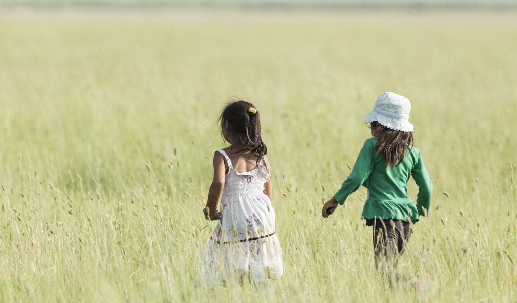 Wallpaper Two little girls walking in the field