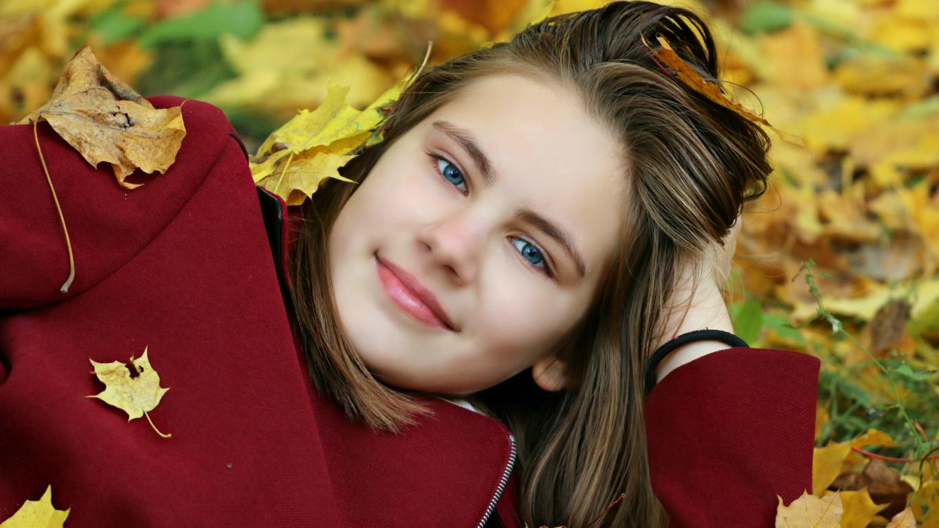 Wallpaper Beautiful blue-eyed girl lies on fallen leaves