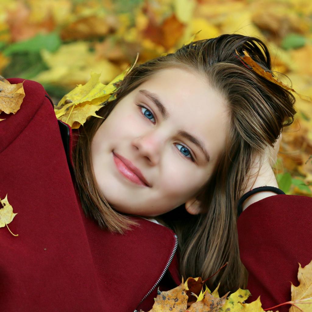 Wallpaper Beautiful blue-eyed girl lies on fallen leaves