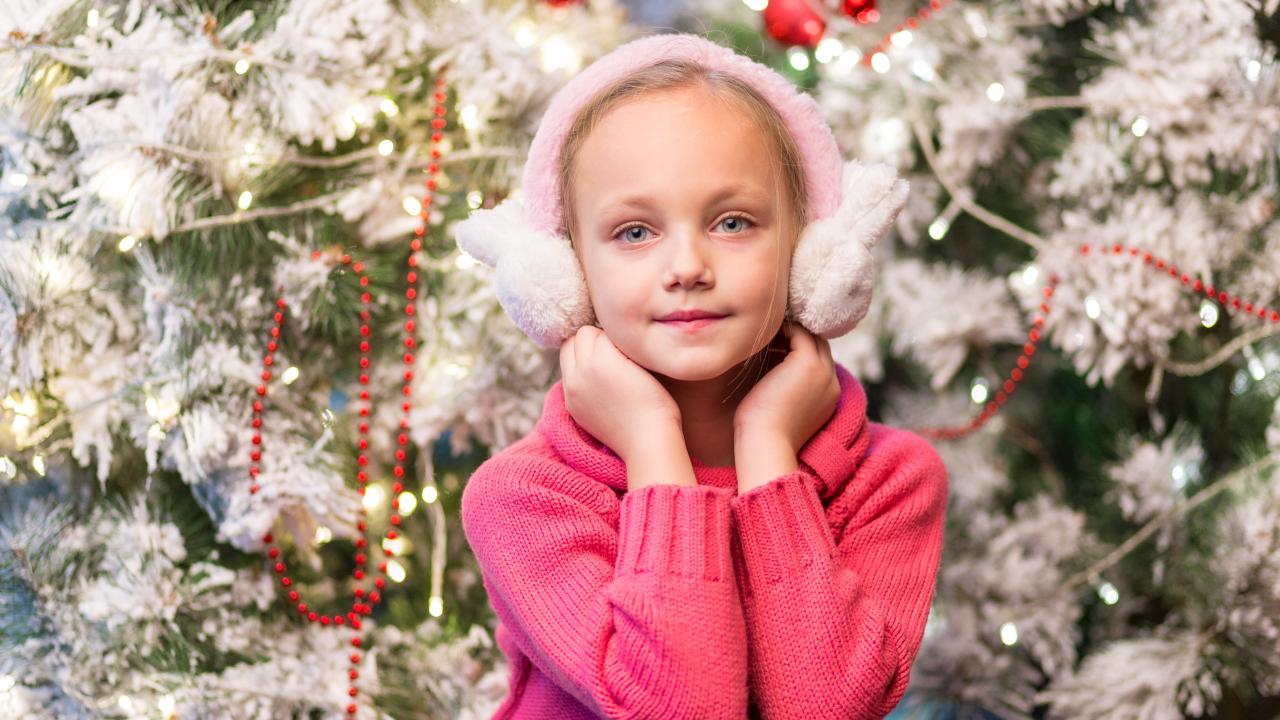 Wallpaper A girl in pink headphones sits by a fir tree