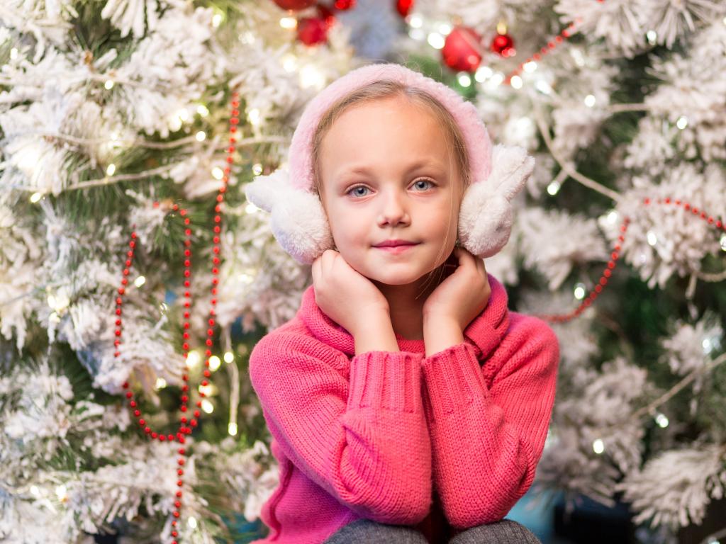 Wallpaper A girl in pink headphones sits by a fir tree