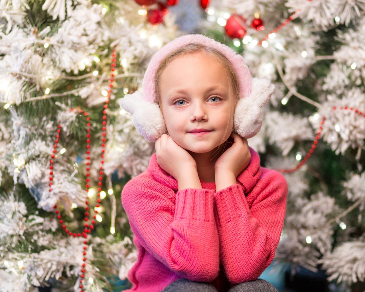 Wallpaper A girl in pink headphones sits by a fir tree
