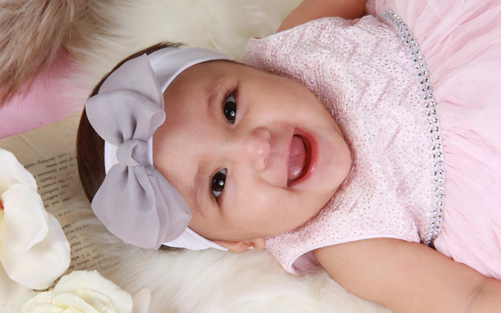 Wallpaper Smiling girl in a pink dress with a bow on her head