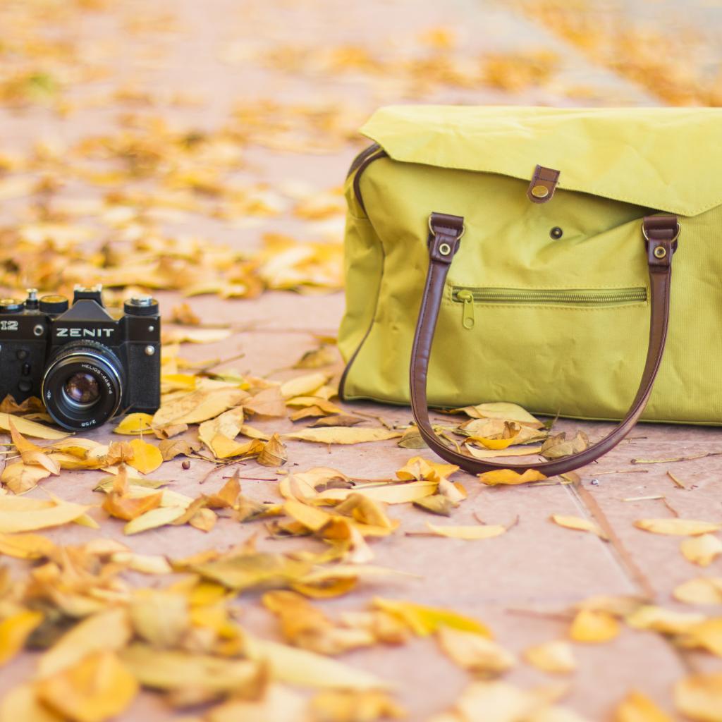 Wallpaper Camera and bag stand on dry leaves in autumn