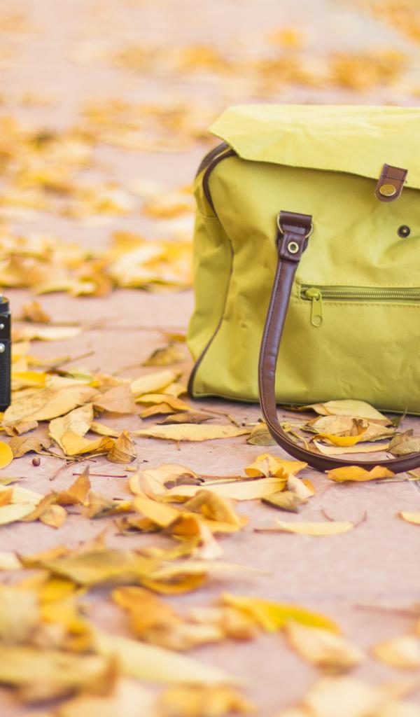 Wallpaper Camera and bag stand on dry leaves in autumn