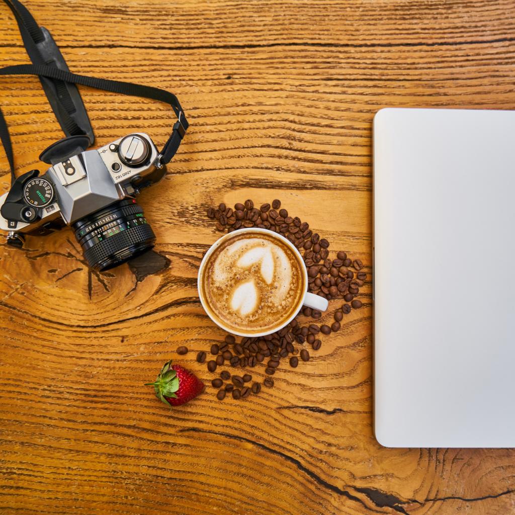 Wallpaper Cup of coffee on a table with a camera and laptop