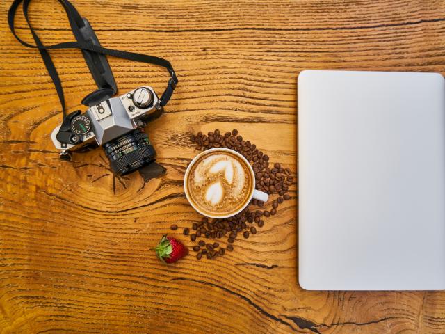 Wallpaper Cup of coffee on a table with a camera and laptop