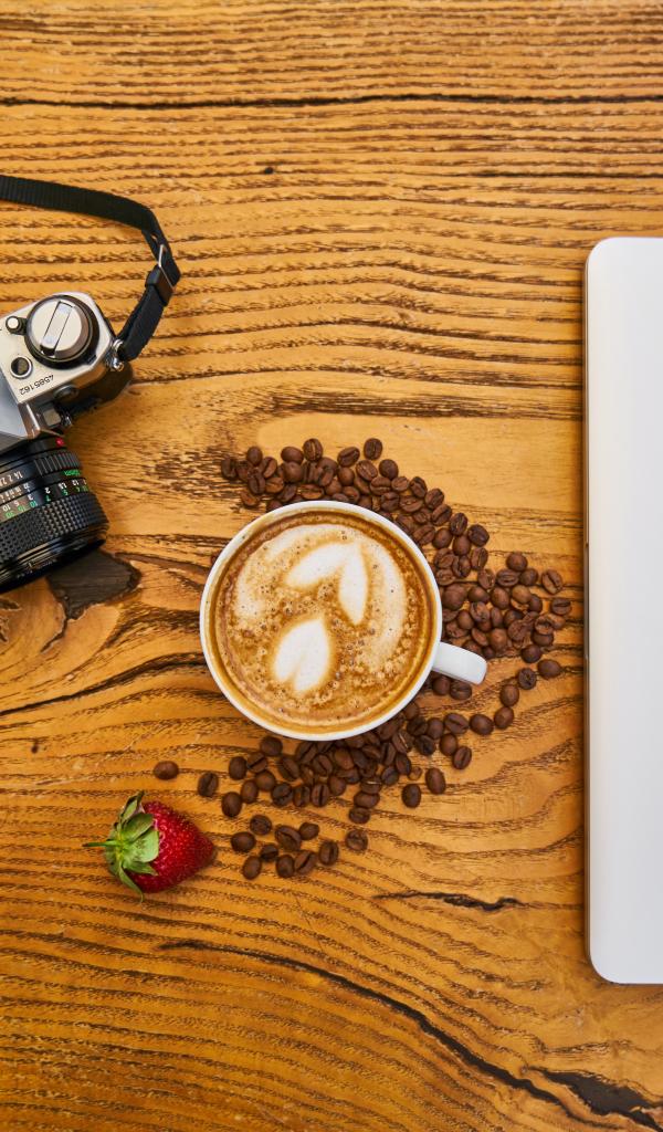 Wallpaper Cup of coffee on a table with a camera and laptop