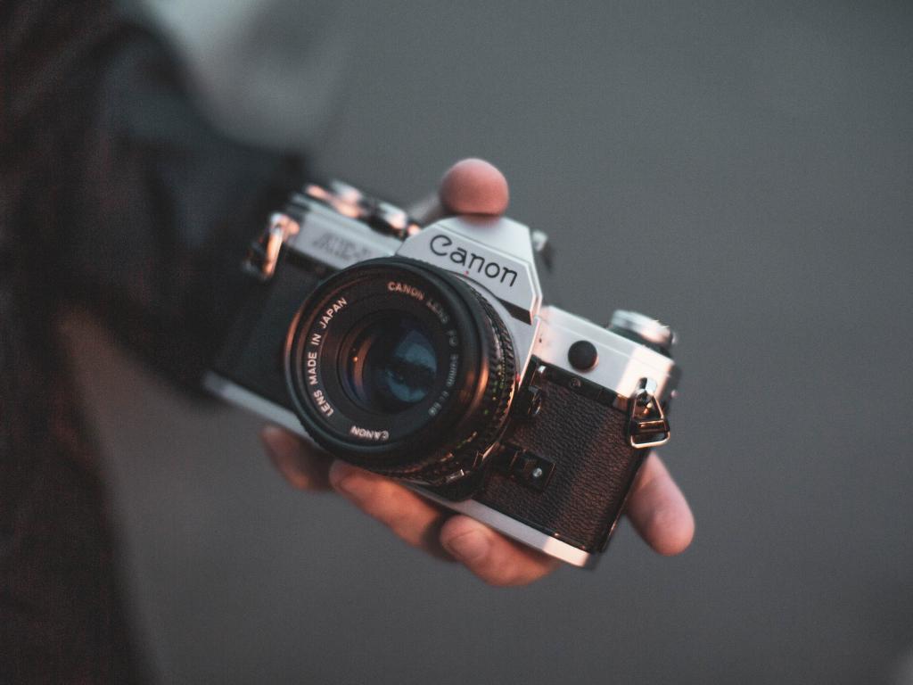 Wallpaper Beautiful girl with a camera in hand stands by a tree