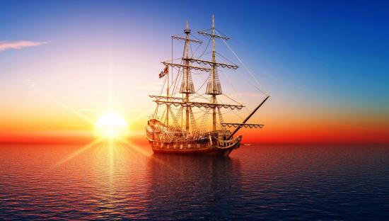 Wallpaper Big pirate ship in the sea at sunset