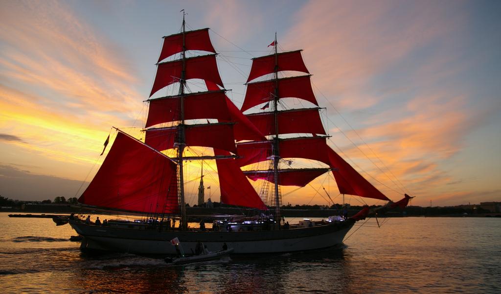Wallpaper Big ship with red sails on sunset background