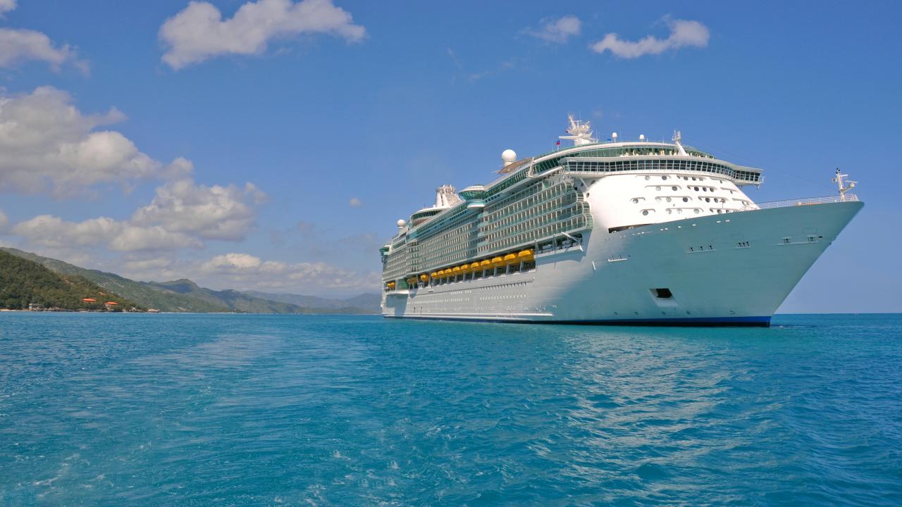 Wallpaper Large white cruise liner at the pier on a tropical beach