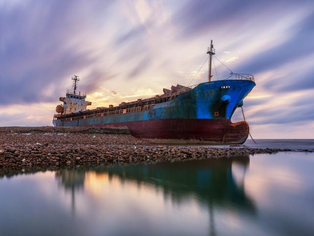 Wallpaper Old rusty ship on the shore under a beautiful sky