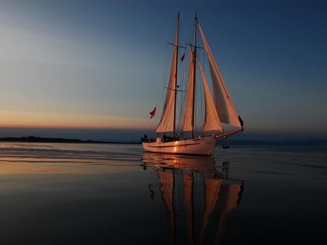 Wallpaper Large yacht with white sails at sunset in the sea