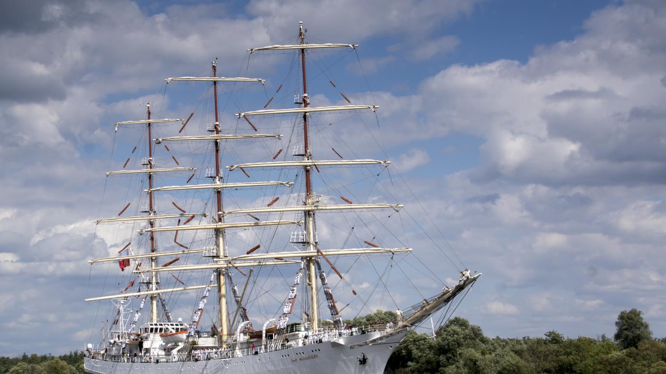 Wallpaper Big ship with white sails at sea under blue sky