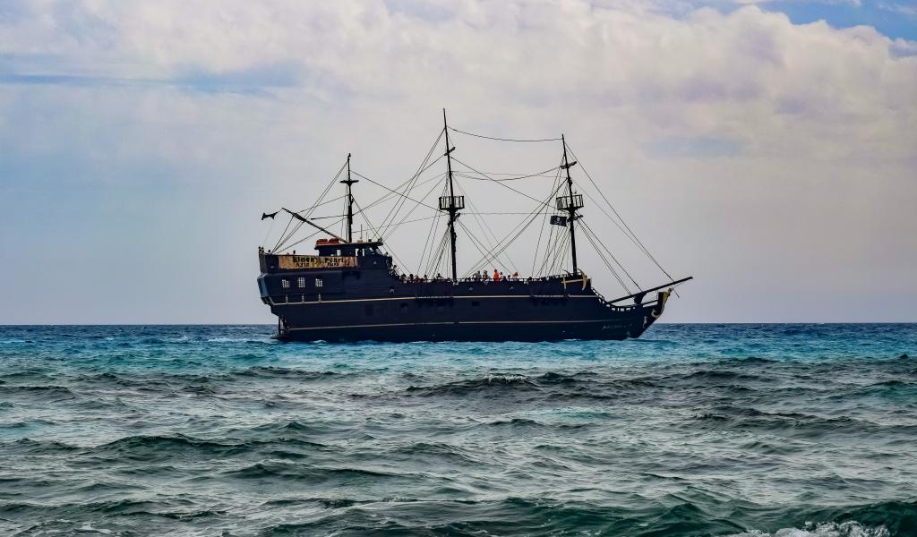 Wallpaper Large black pirate ship with lowered sails at sea