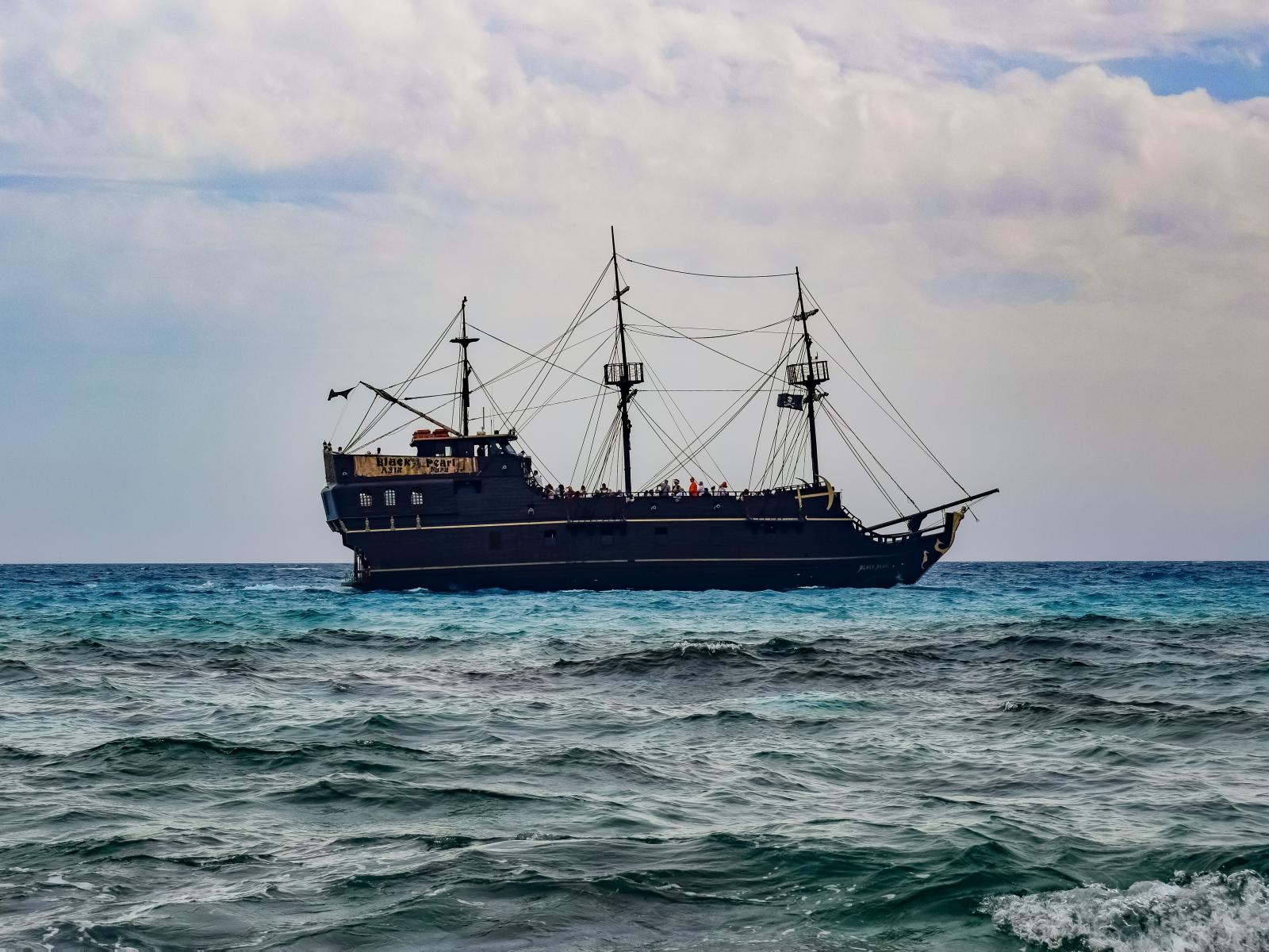 Wallpaper Large black pirate ship with lowered sails at sea