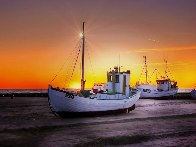 Wallpaper Fishing boat on the shore at sunset