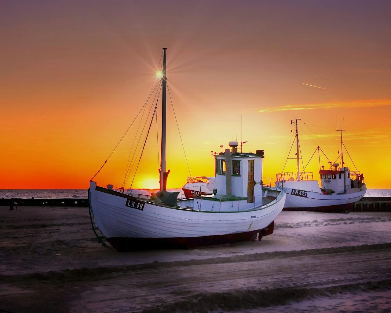 » Wallpaper Fishing boat on the shore at sunset