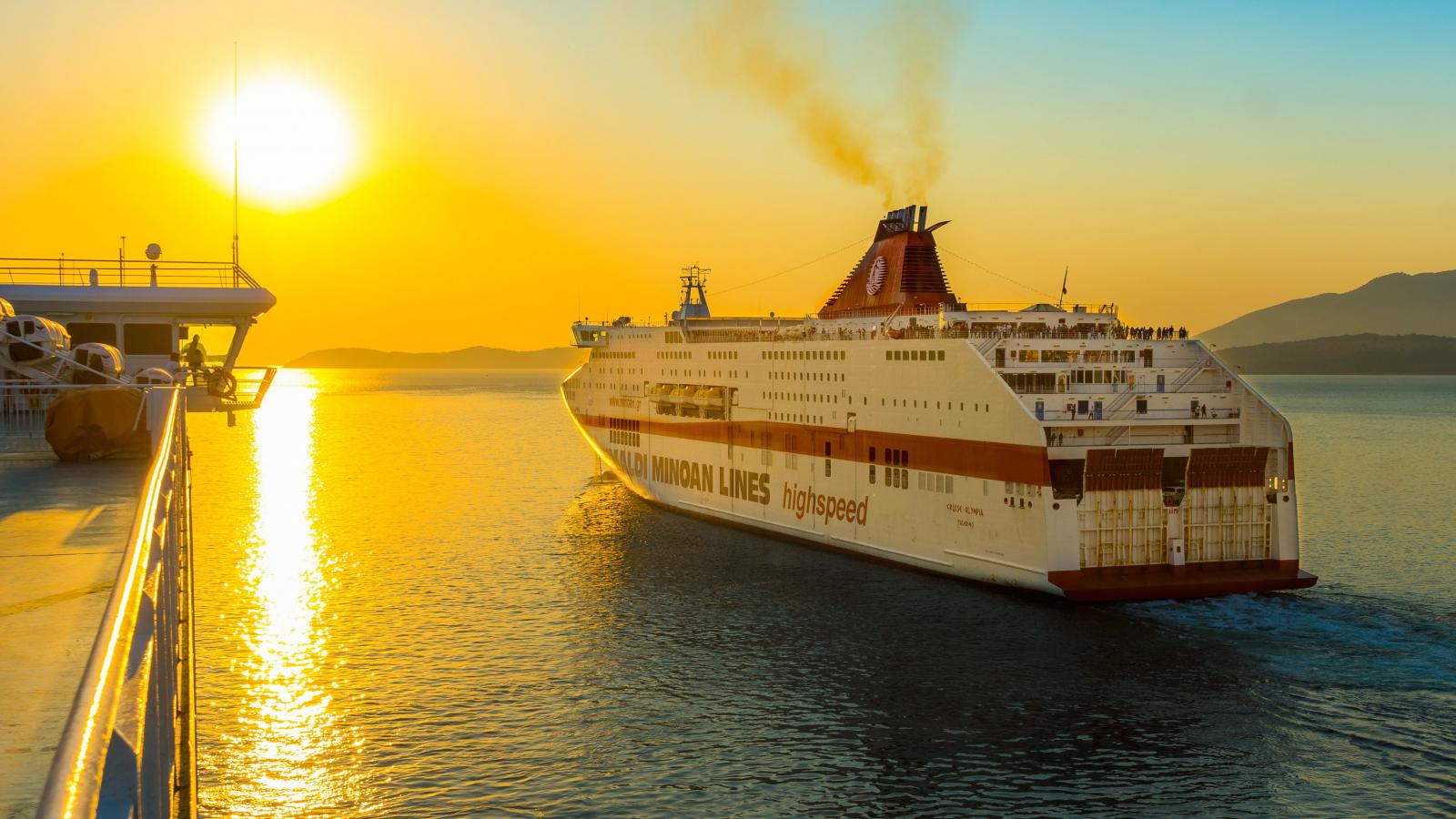 Wallpaper Large cruise ship sailing into the sunset