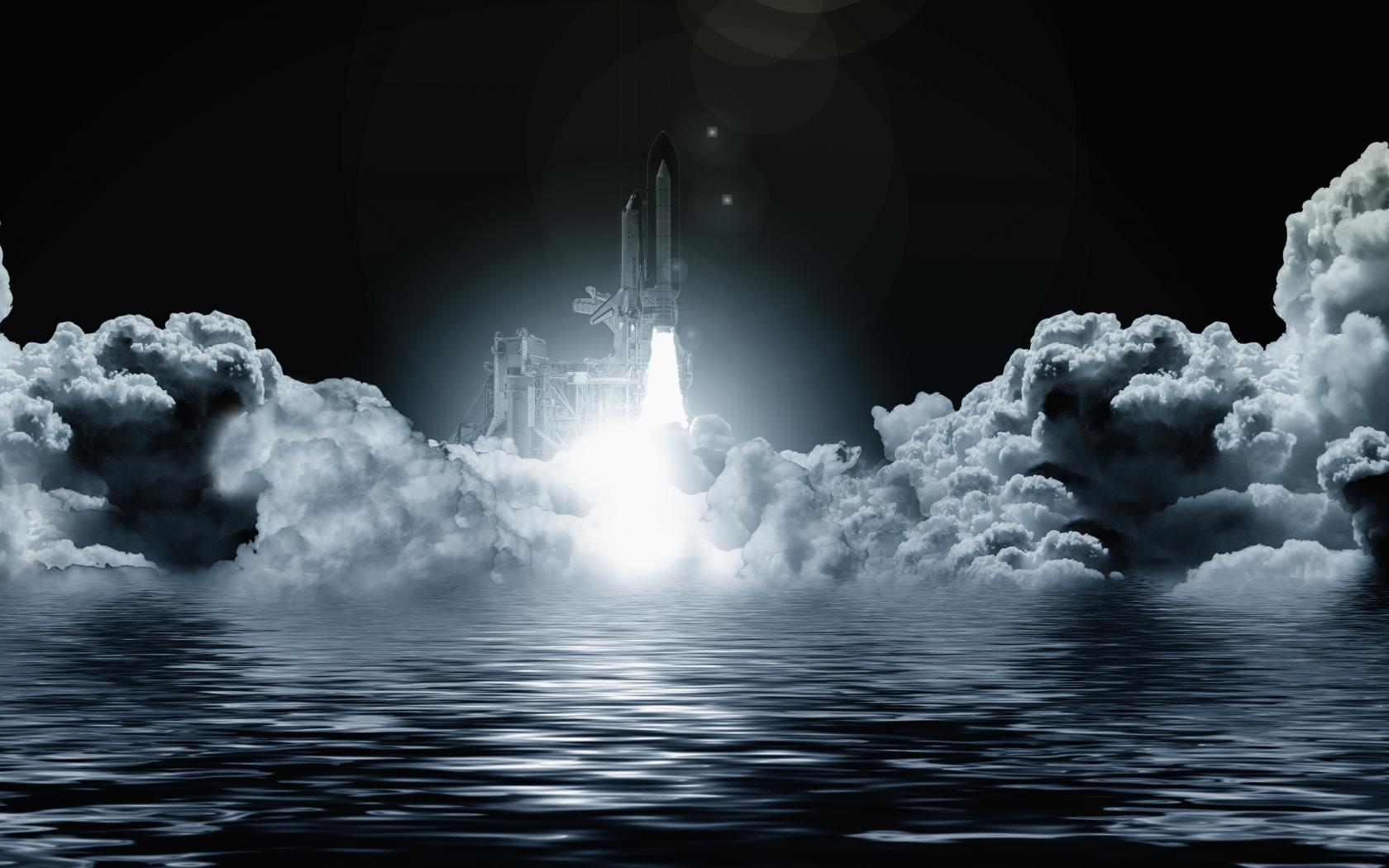 Wallpaper Start rocket in the clouds on the background of water