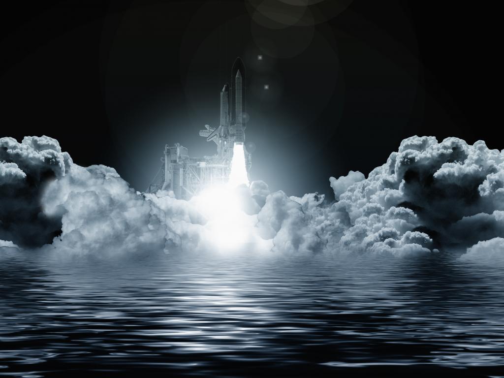 Wallpaper Start rocket in the clouds on the background of water