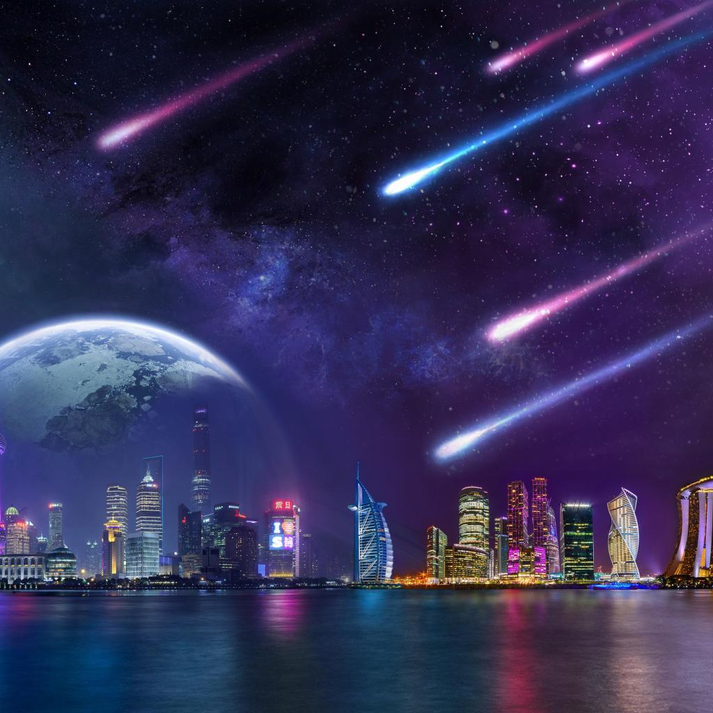 Wallpaper Meteorites in the sky with planets set on a megalopolis at night