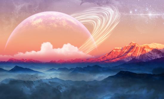 Wallpaper Fantastic sky with planets over snow-capped mountains.