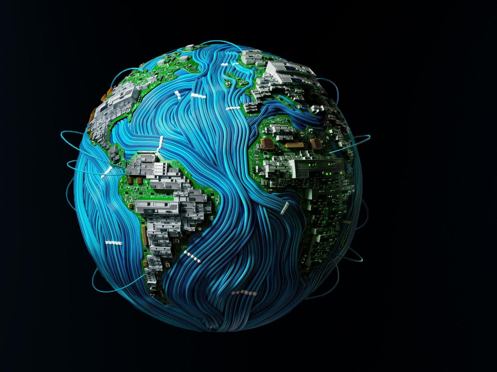 Wallpaper The planet earth is shrouded in wires on a black background
