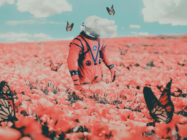 Wallpaper An astronaut walks across a field with butterflies and red poppies