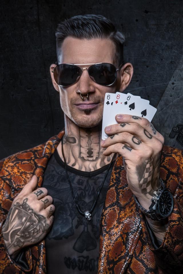 Wallpaper A man with tattoos on his body holds three six cards in his hand