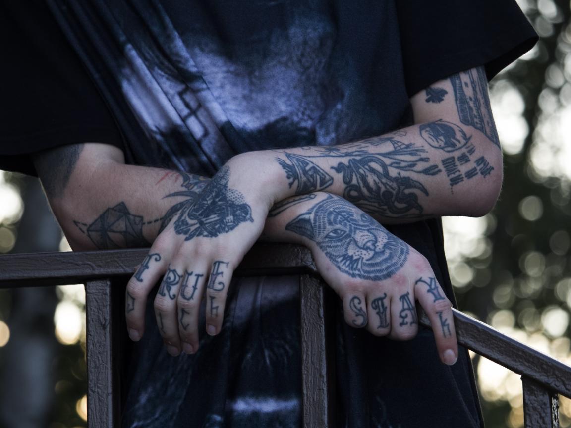 Wallpaper Tattoos on the arms of a guy in a black t-shirt