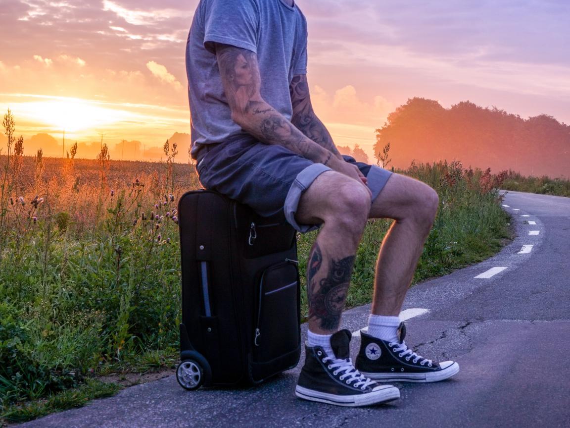 Wallpaper A man with tattoos on his body sits on a suitcase