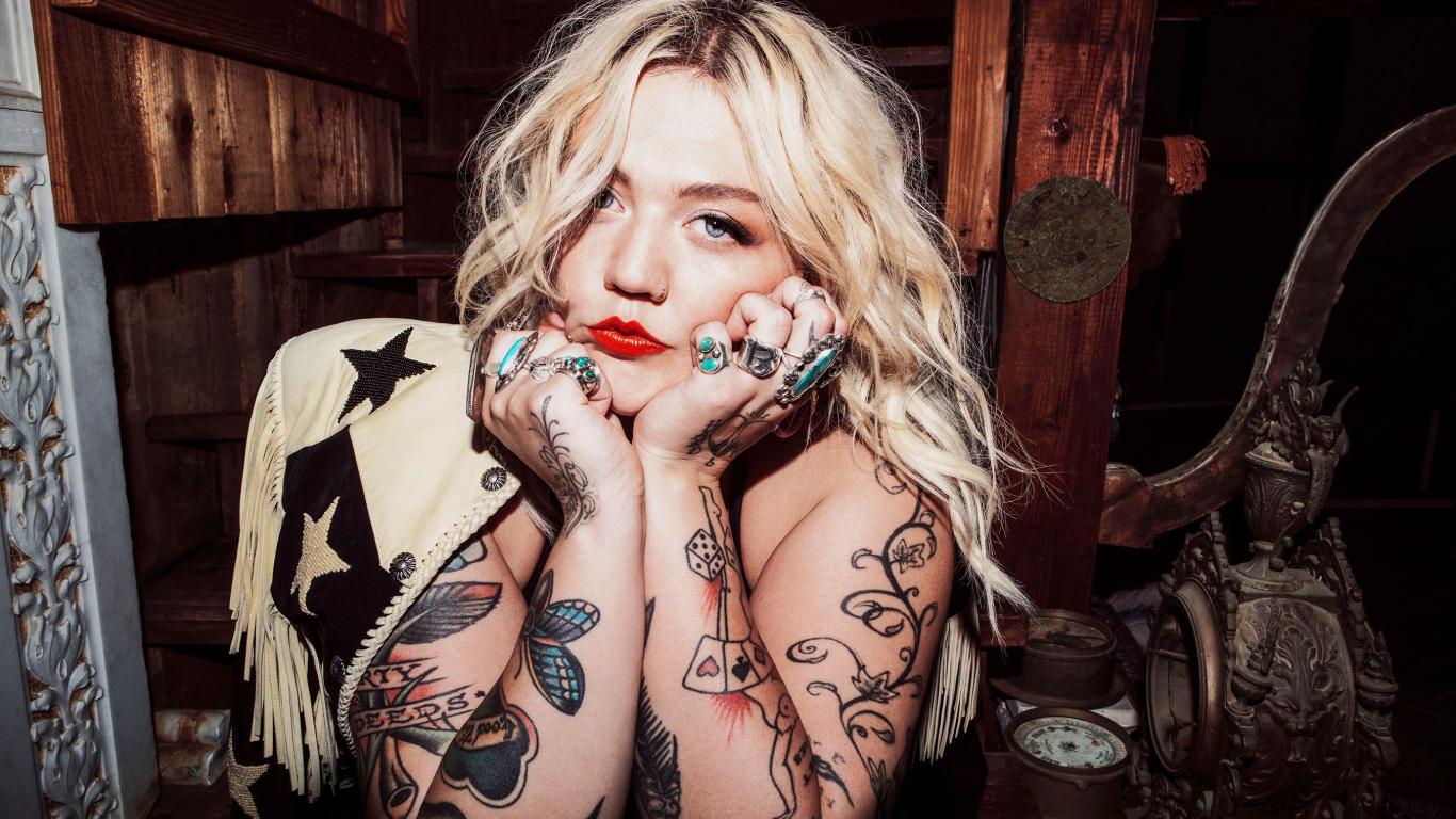 Wallpaper Blue-eyed blonde with tattoos on her arms