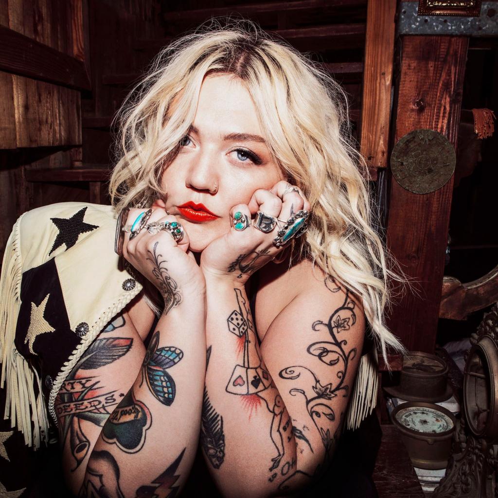 Wallpaper Blue-eyed blonde with tattoos on her arms