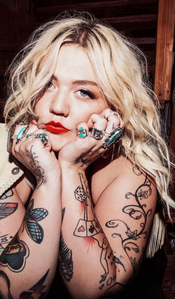 Wallpaper Blue-eyed blonde with tattoos on her arms