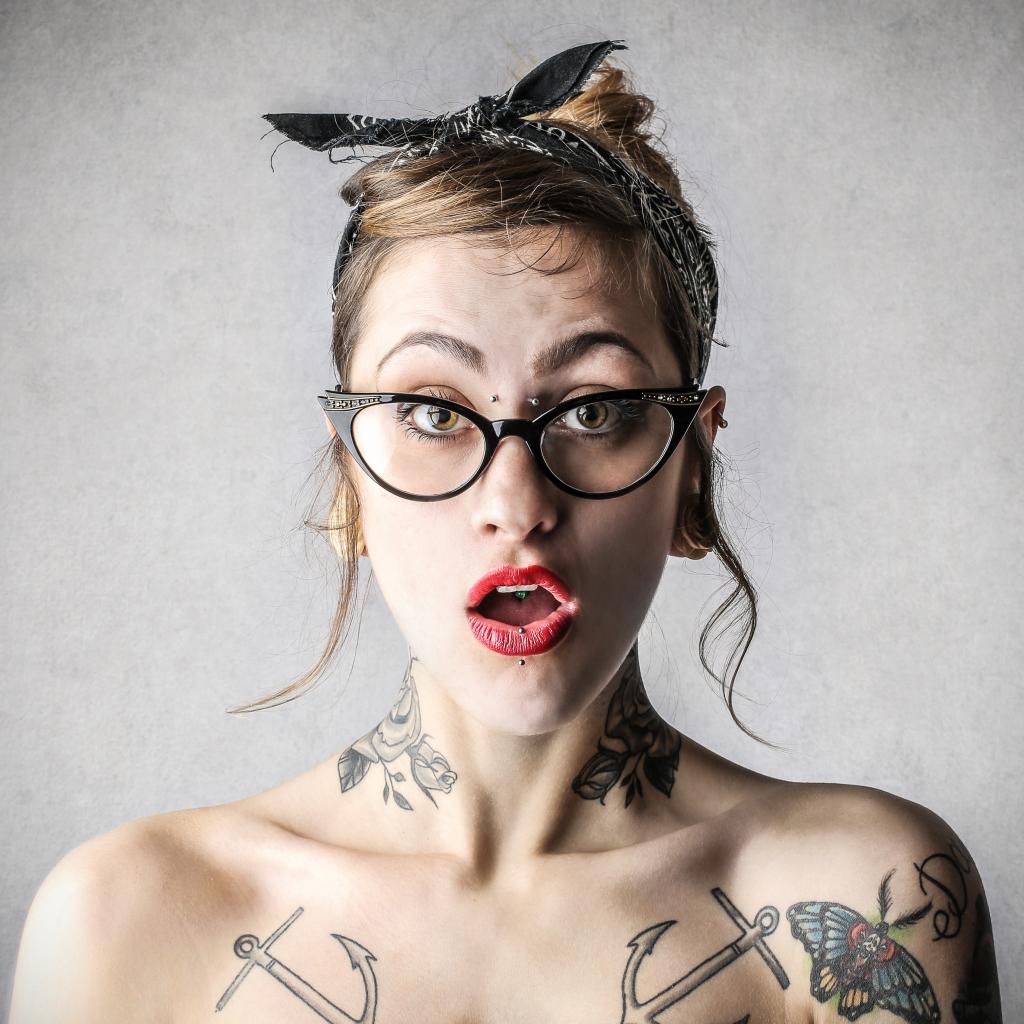 Wallpaper Surprised girl in glasses with tattoos on her body