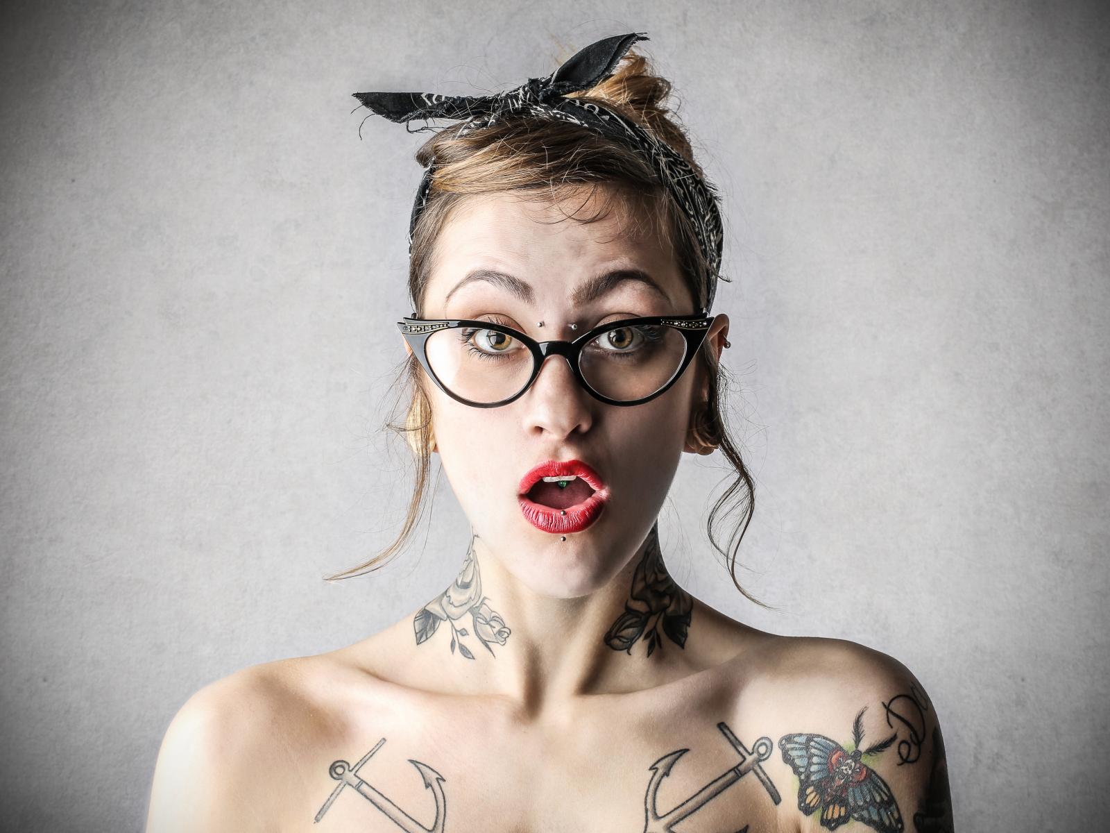 Wallpaper Surprised girl in glasses with tattoos on her body
