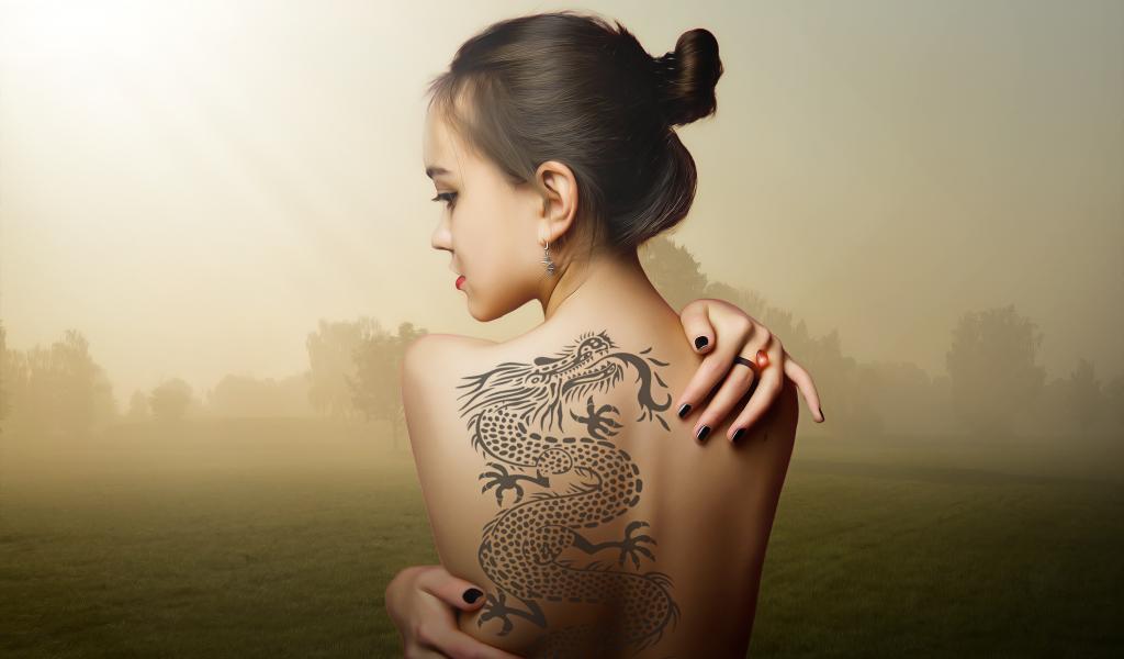Wallpaper Beautiful girl with a dragon tattoo on her back