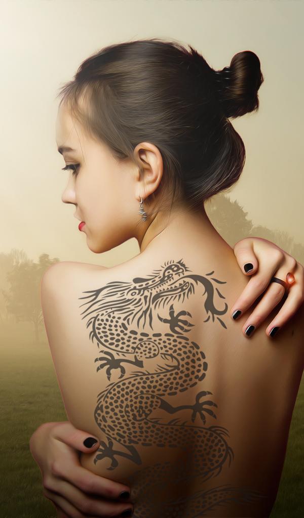 Wallpaper Beautiful girl with a dragon tattoo on her back