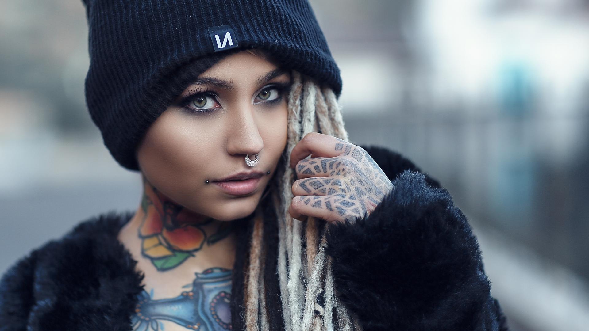 Wallpaper Beautiful girl in a black hat with tattoos on her body