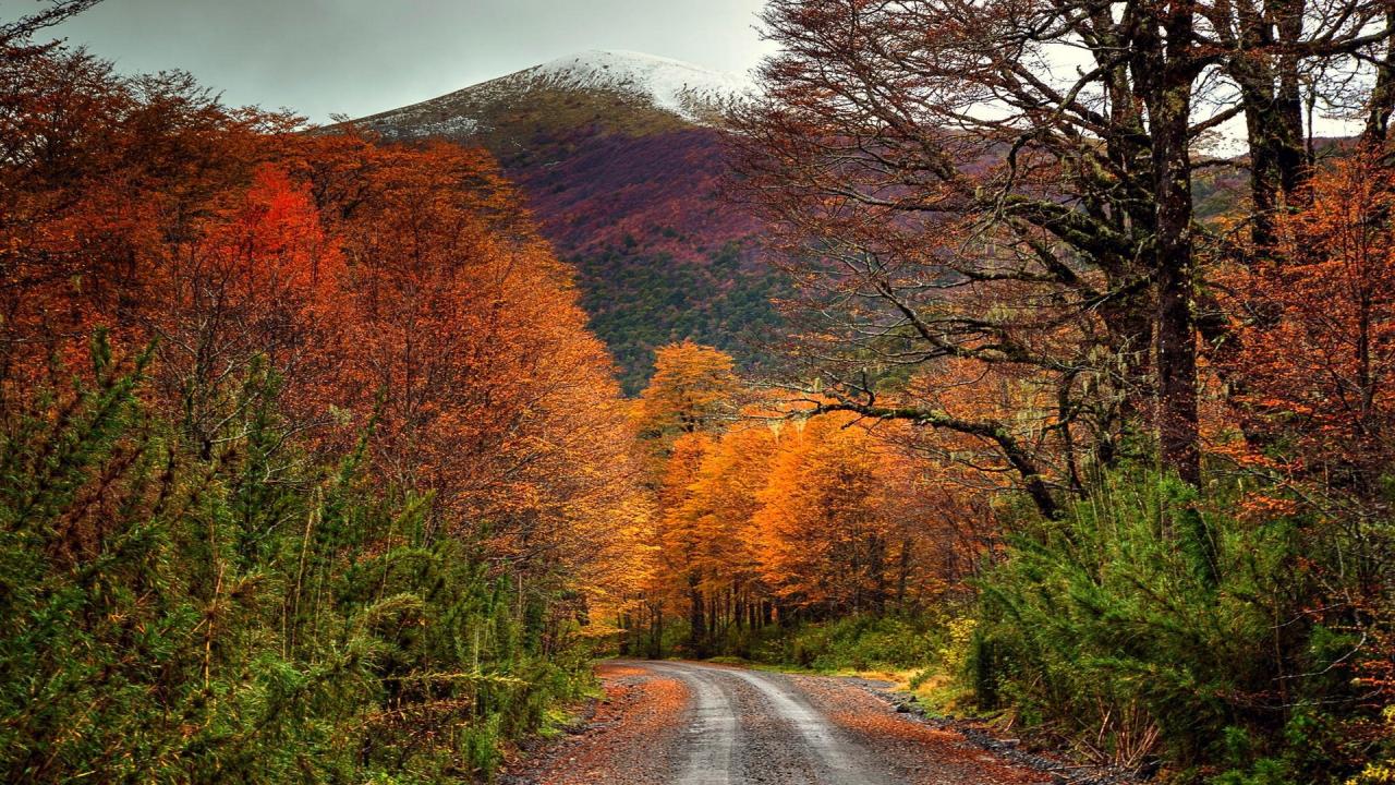 Wallpaper Road in the autumn forest at the foot of the mountain, Chile