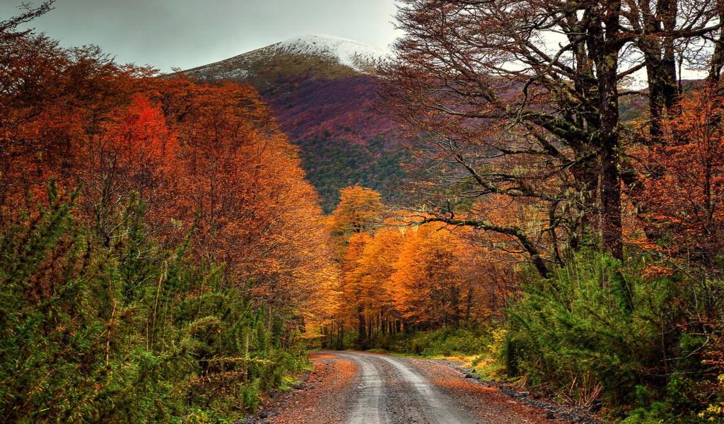 Wallpaper Road in the autumn forest at the foot of the mountain, Chile